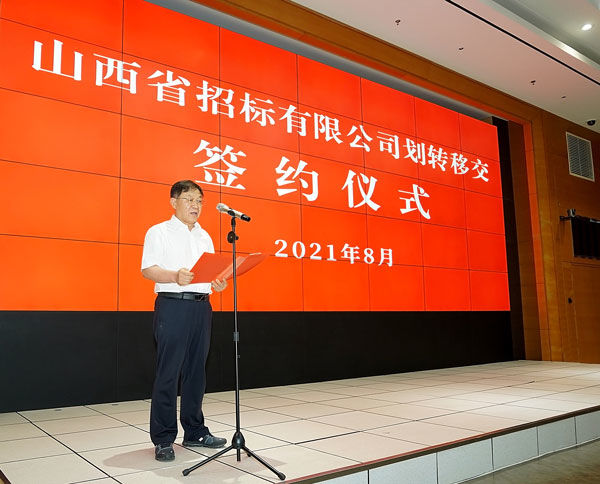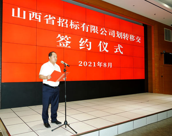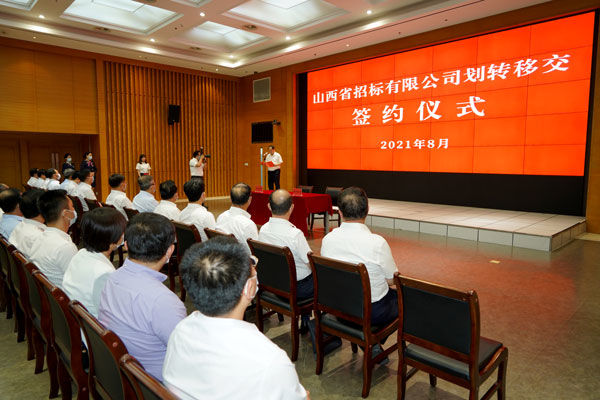 8月5日下午,由山西省行政審批服務(wù)管理局與省機關(guān)事務(wù)管理局舉辦的山西省招標(biāo)有限公司劃轉(zhuǎn)移交簽約儀式,在省政務(wù)服務(wù)中心報告廳隆重舉行。省行政審批局局長李東洪及班子成員、省機關(guān)事務(wù)局毛益民局長及班子成員、后勤體制改革領(lǐng)導(dǎo)小組改革專班負(fù)責(zé)人崔志明、晉勤集團(tuán)董事長楊文治及班子成員、省行政審批局、省機關(guān)事務(wù)局相關(guān)處室負(fù)責(zé)人出席儀式,晉勤集團(tuán)、省招標(biāo)公司相關(guān)工作人員參加儀式。