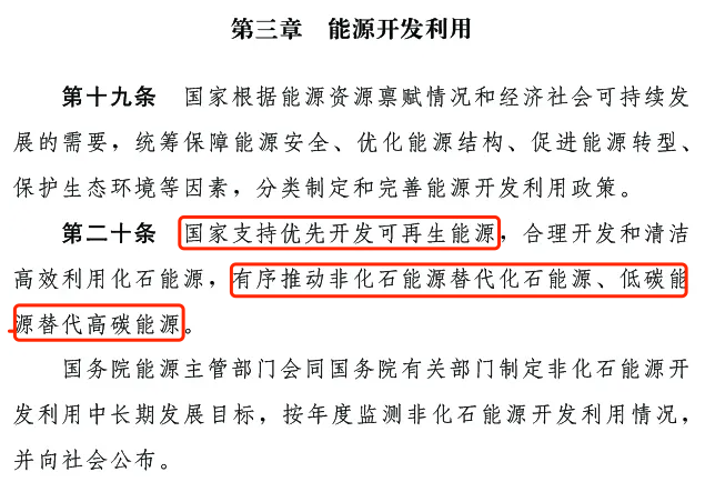 第二十條:國(guó)家支持優(yōu)先開(kāi)發(fā)可再生能源,合理開(kāi)發(fā)和清潔高效利用化石能源,有序推動(dòng)非化石能源替代化石能源、低碳能源替代高碳能源。國(guó)務(wù)院能源主管部門(mén)會(huì)同國(guó)務(wù)院有關(guān)部門(mén)制定非化石能源開(kāi)發(fā)利用中長(zhǎng)期發(fā)展目標(biāo),按年度檢測(cè)非化石能源開(kāi)發(fā)利用情況,并向社會(huì)公布。