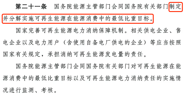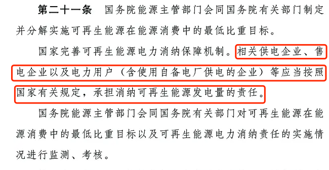 第二十一條:國(guó)家完善可再生能源電力消納保障機(jī)制。相關(guān)供電企業(yè)、售電企業(yè)以及電力用戶 (含使用自備電廠供電的企業(yè))等應(yīng)當(dāng)按照國(guó)家有關(guān)規(guī)定,承擔(dān)消納可再生能源發(fā)電量的責(zé)任。國(guó)務(wù)院能源主管部門(mén)會(huì)同國(guó)務(wù)院有關(guān)部門(mén)對(duì)可再生能源在能源消費(fèi)中的最低比重目標(biāo)以及可再生能源電力消納責(zé)任的實(shí)施情況進(jìn)行監(jiān)測(cè)、考核。