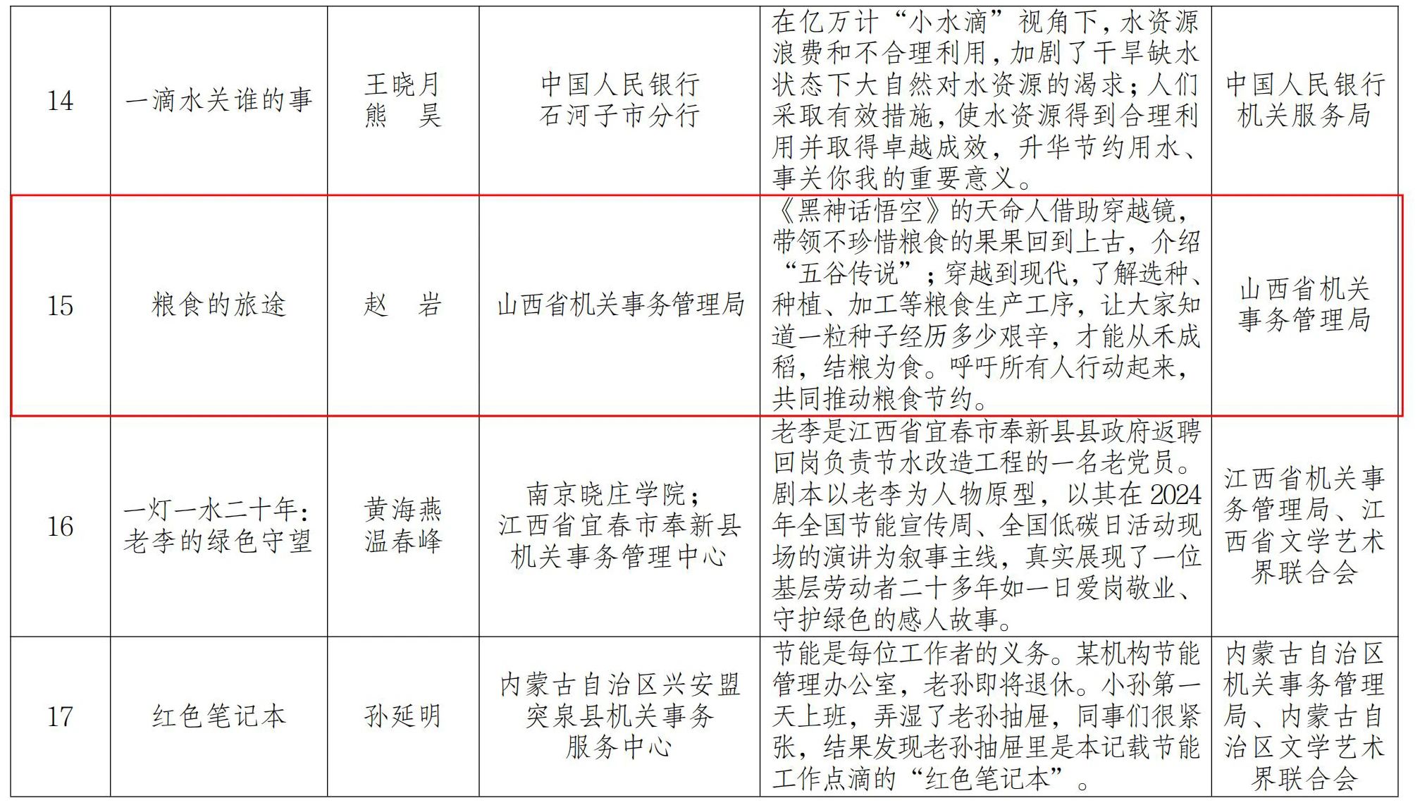 近日,國管局辦公室、中國文聯(lián)辦公室組織的2024年公共機(jī)構(gòu)節(jié)能主題優(yōu)秀劇本和故事征集活動(dòng)結(jié)果揭曉,山西省機(jī)關(guān)事務(wù)管理局選送的劇本《糧食的旅途》入圍優(yōu)秀劇本獎(jiǎng)項(xiàng)。